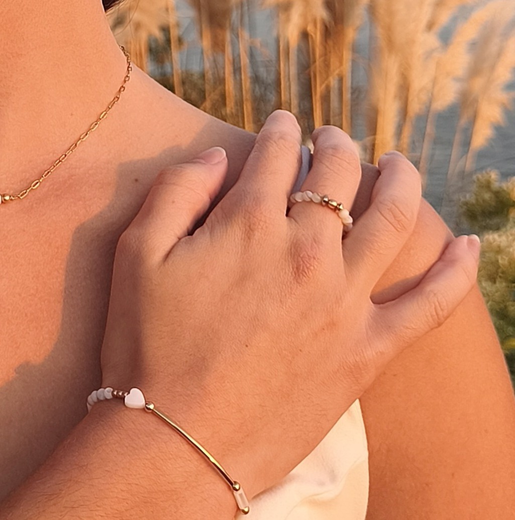 faite main avec soin, la bague Éclat Pur incarne toute la délicatesse et l’authenticité de la collection Éclat Bohème. Composée de perles naturelles aux reflets nacrés et de fines touches dorées, elle reflète la lumière avec douceur et élégance.
