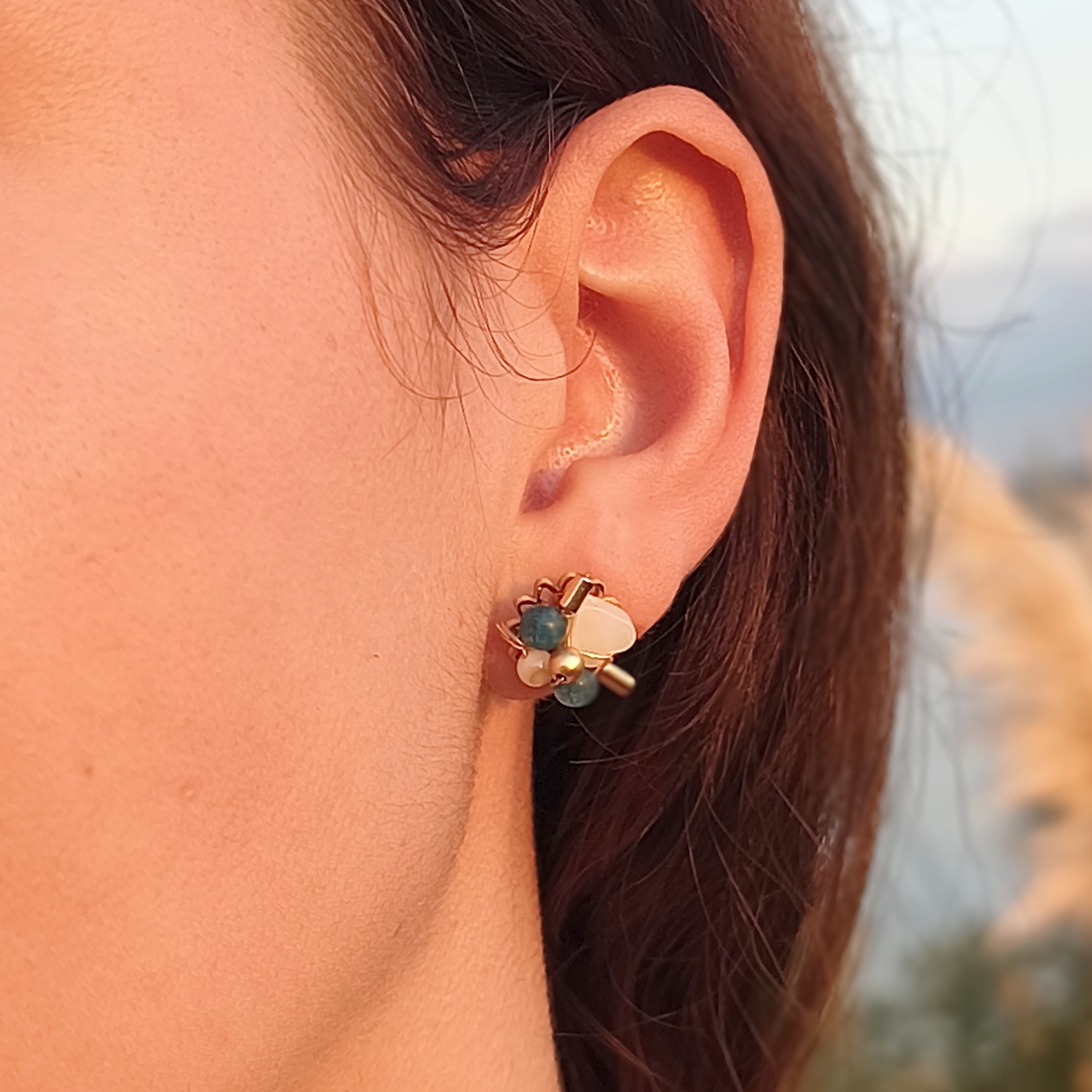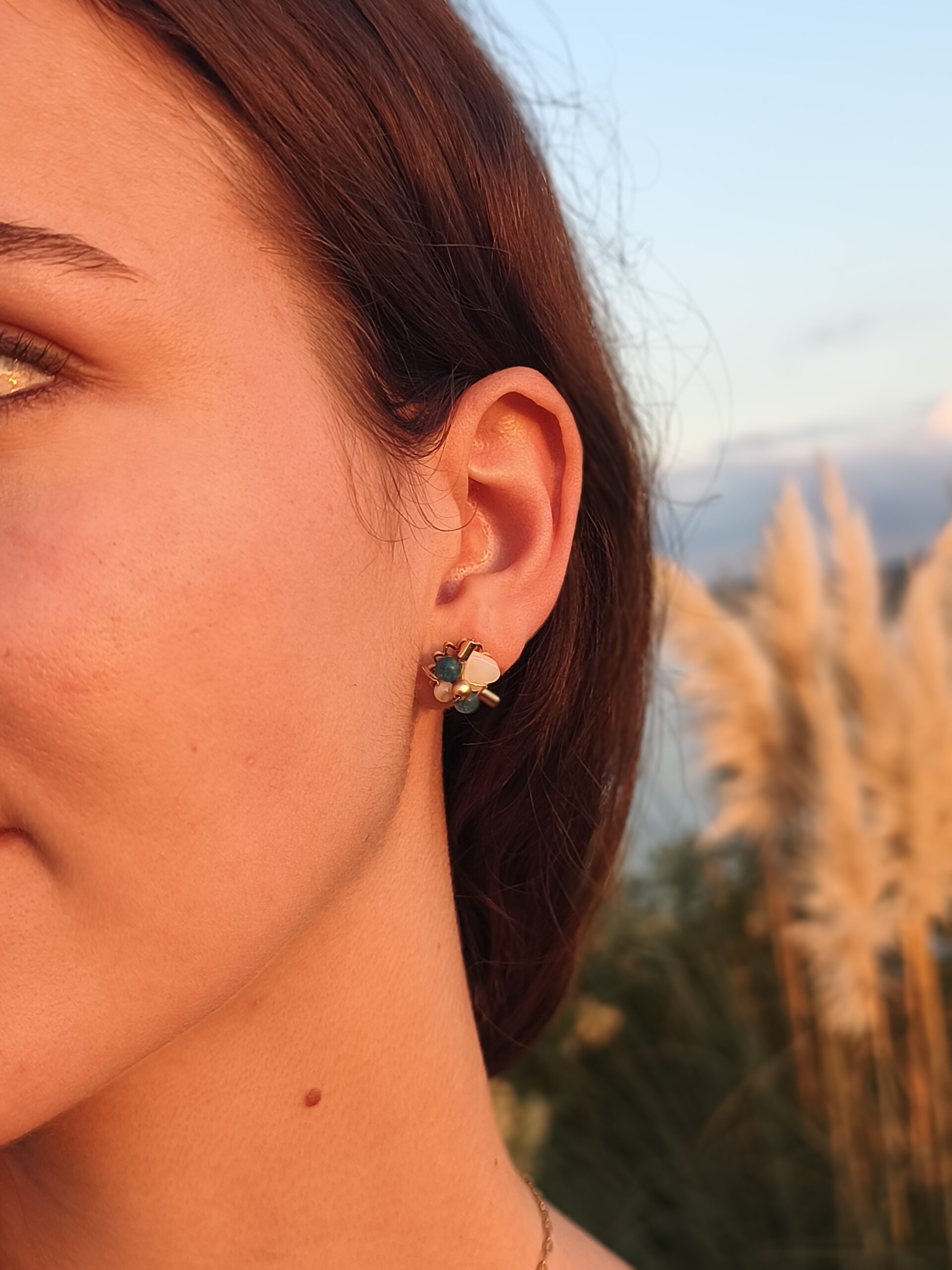 Les boucles d’oreilles Éclat d’Azur incarnent la rencontre parfaite entre délicatesse et caractère. Leur composition de petites pierres bleu profond et d’éléments nacrés capte la lumière avec une intensité subtile, créant un jeu d’éclats qui illumine naturellement le visage.