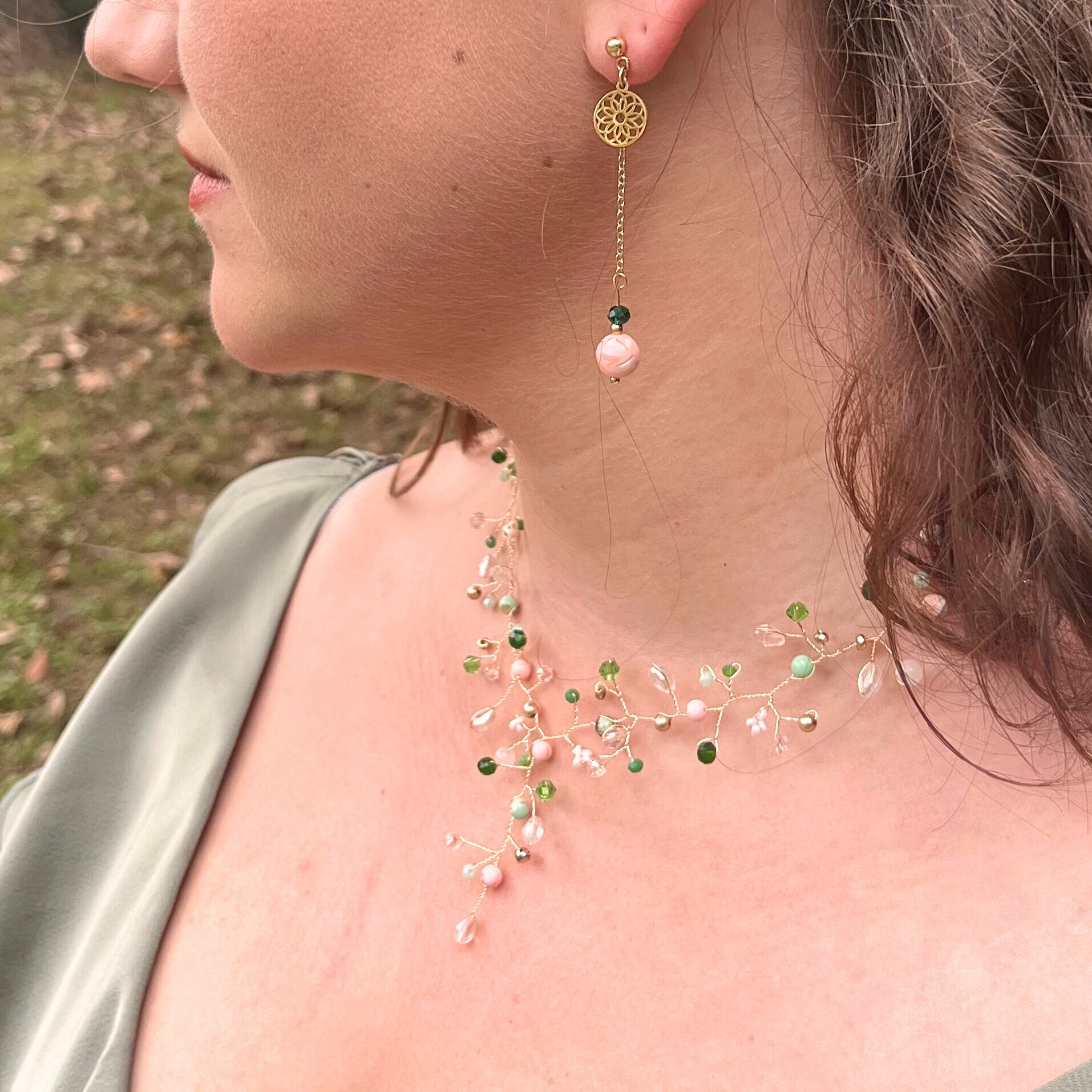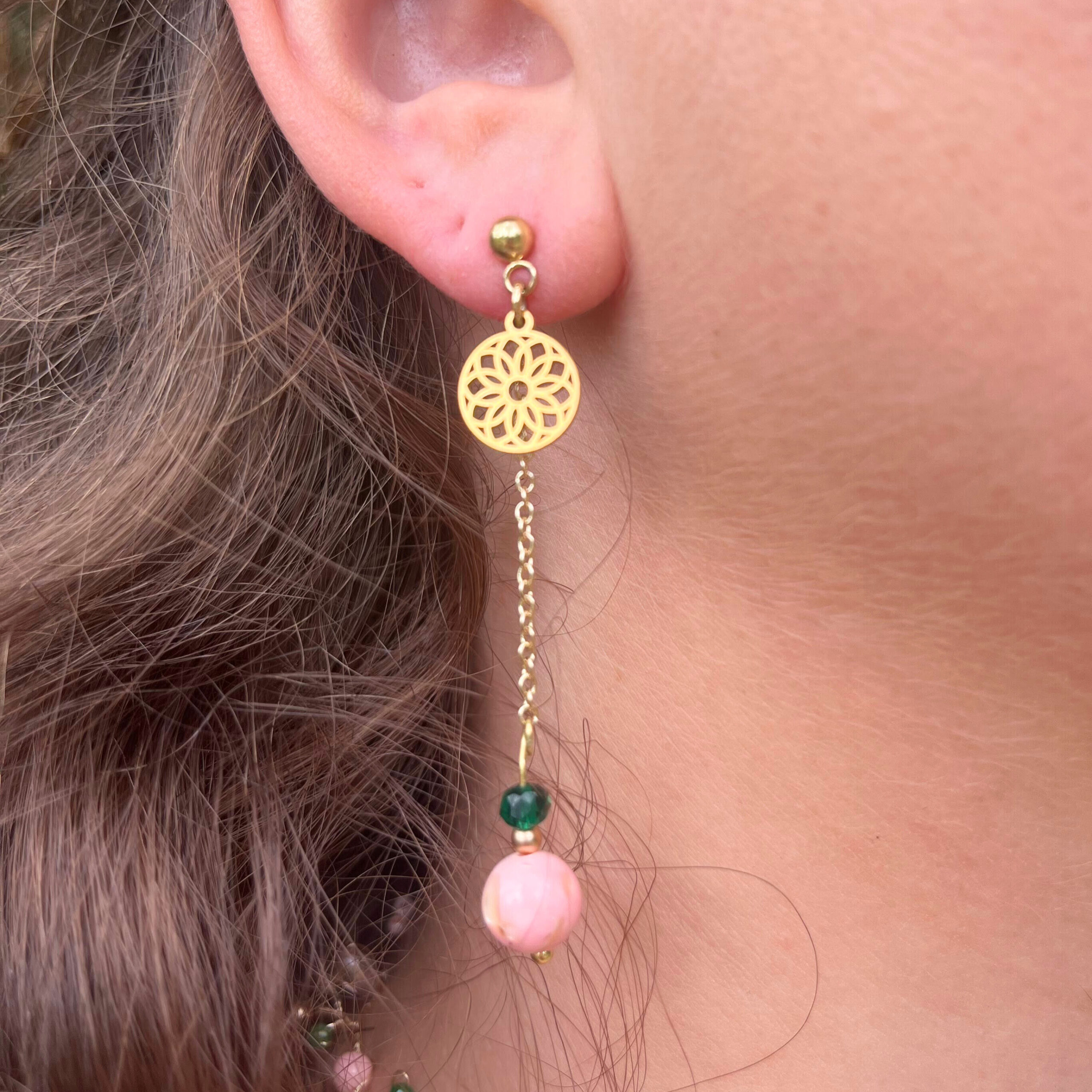 Elles se composent d’un bouton doré orné d’un motif ajouré délicat, prolongé par une fine chaîne dorée. Au bout de celle-ci se balancent deux perles, l’une vert foncé et l’autre d’un rose tendre, apportant une note de douceur et d’élégance.