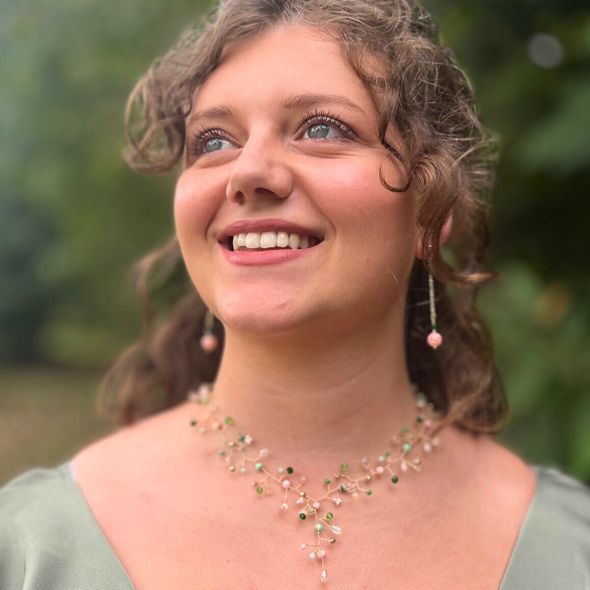 Fleur Bohème illumine le visage d’une touche délicate : un motif floral ajouré, une chaîne fine et des perles aux teintes naturelles pour une allure douce, poétique et résolument bohème.