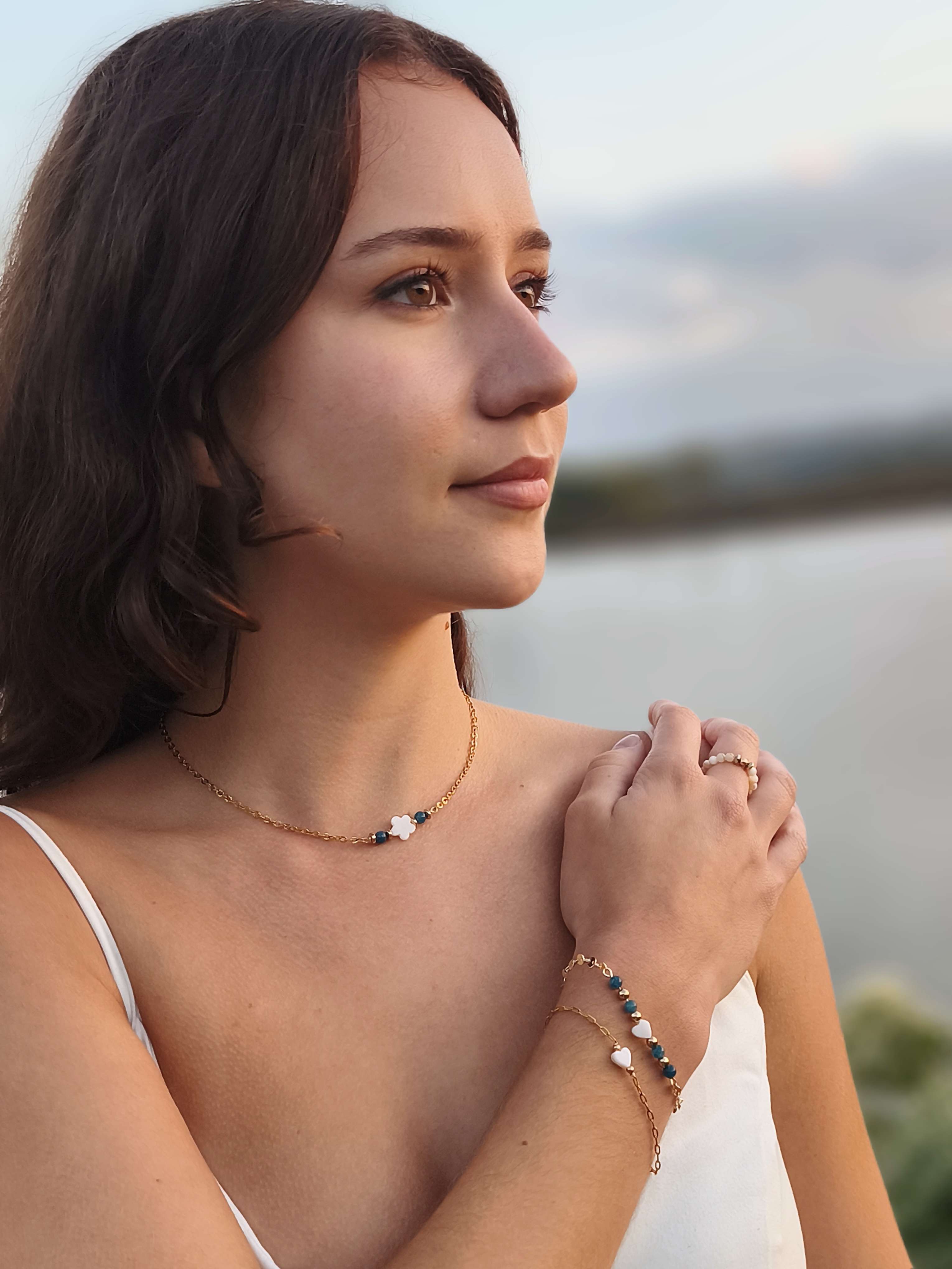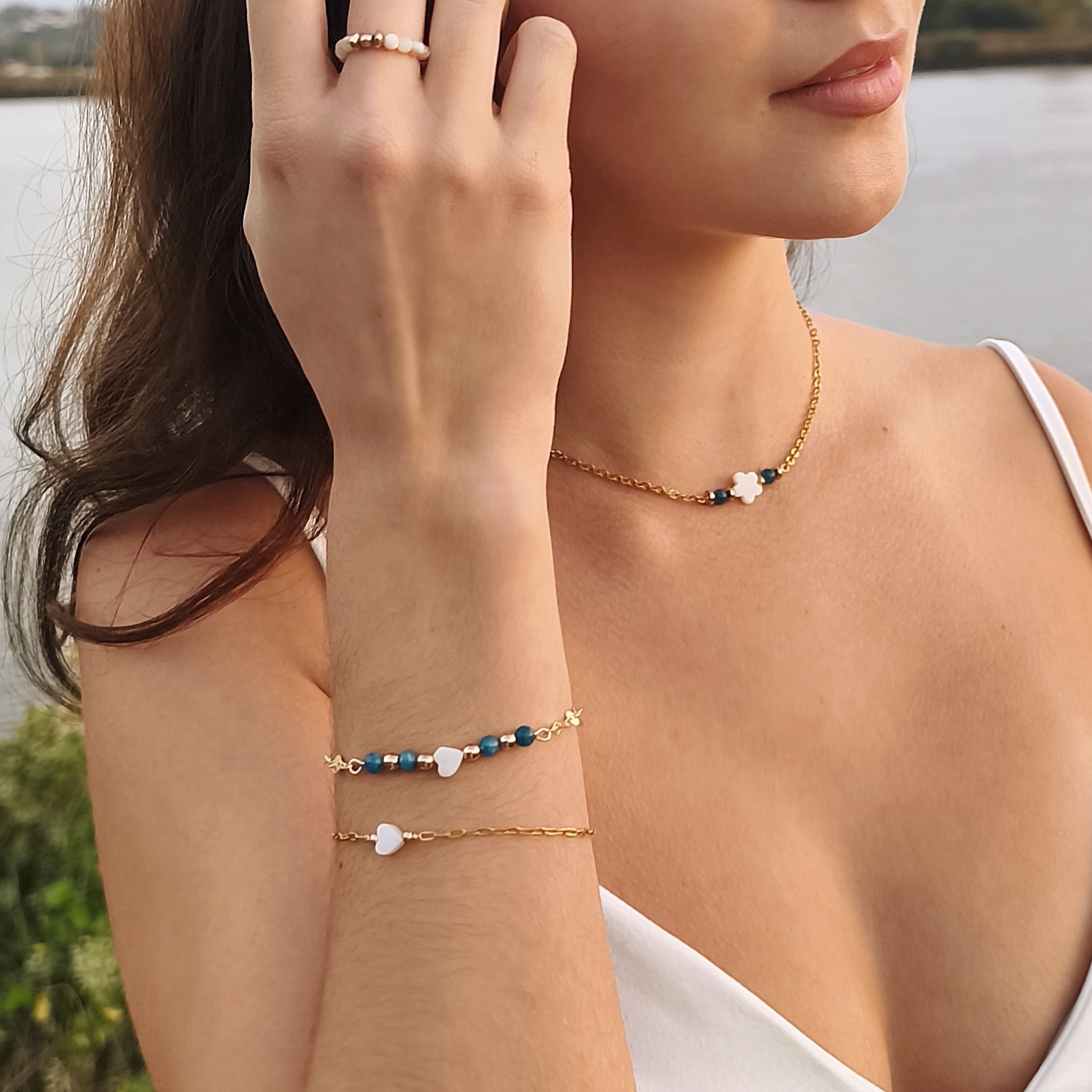 Ses perles bleues et son cœur nacré apportent une touche de poésie qui illumine le poignet.