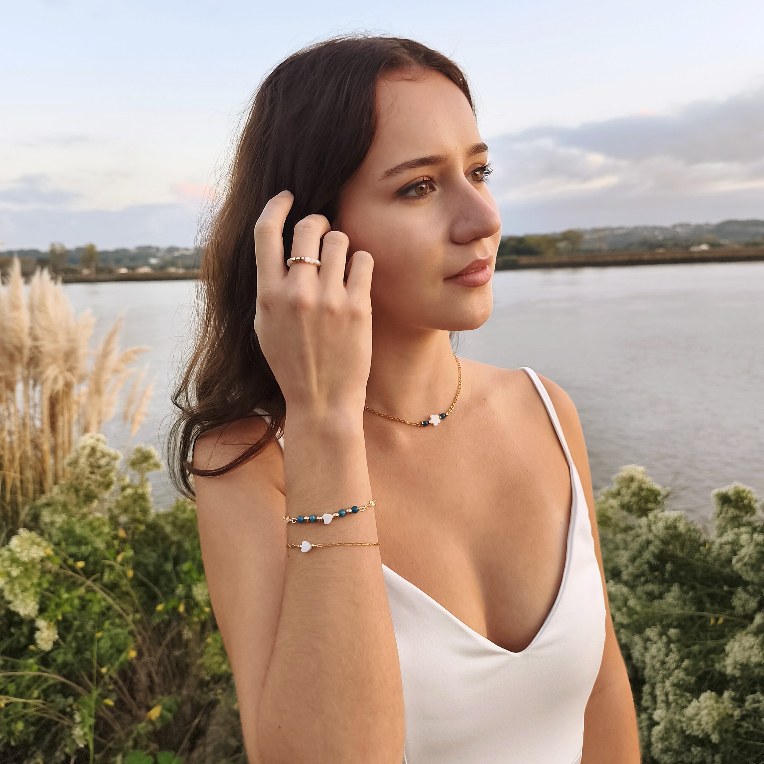 Le bracelet Éclat d’Azur est une véritable ode à la finesse. Ses perles bleues, vibrantes et lumineuses, se mêlent à la douceur d’un cœur nacré pour former une pièce harmonieuse, délicate et résolument moderne.