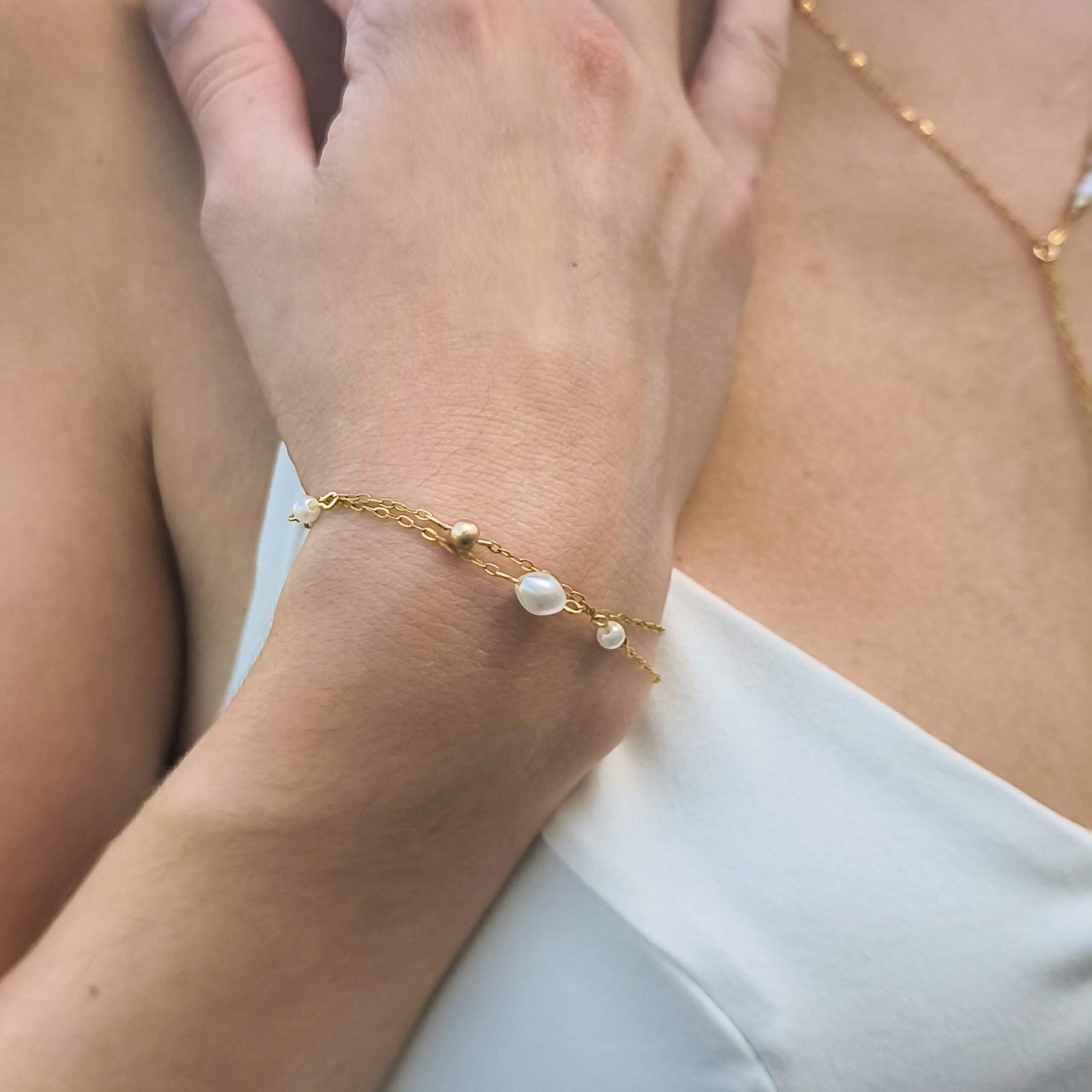 Chaque maillon en acier inoxydable doré accueille une perle nacrée ainsi qu’une perle hématite 14k, pour un équilibre parfait entre finesse et caractère.