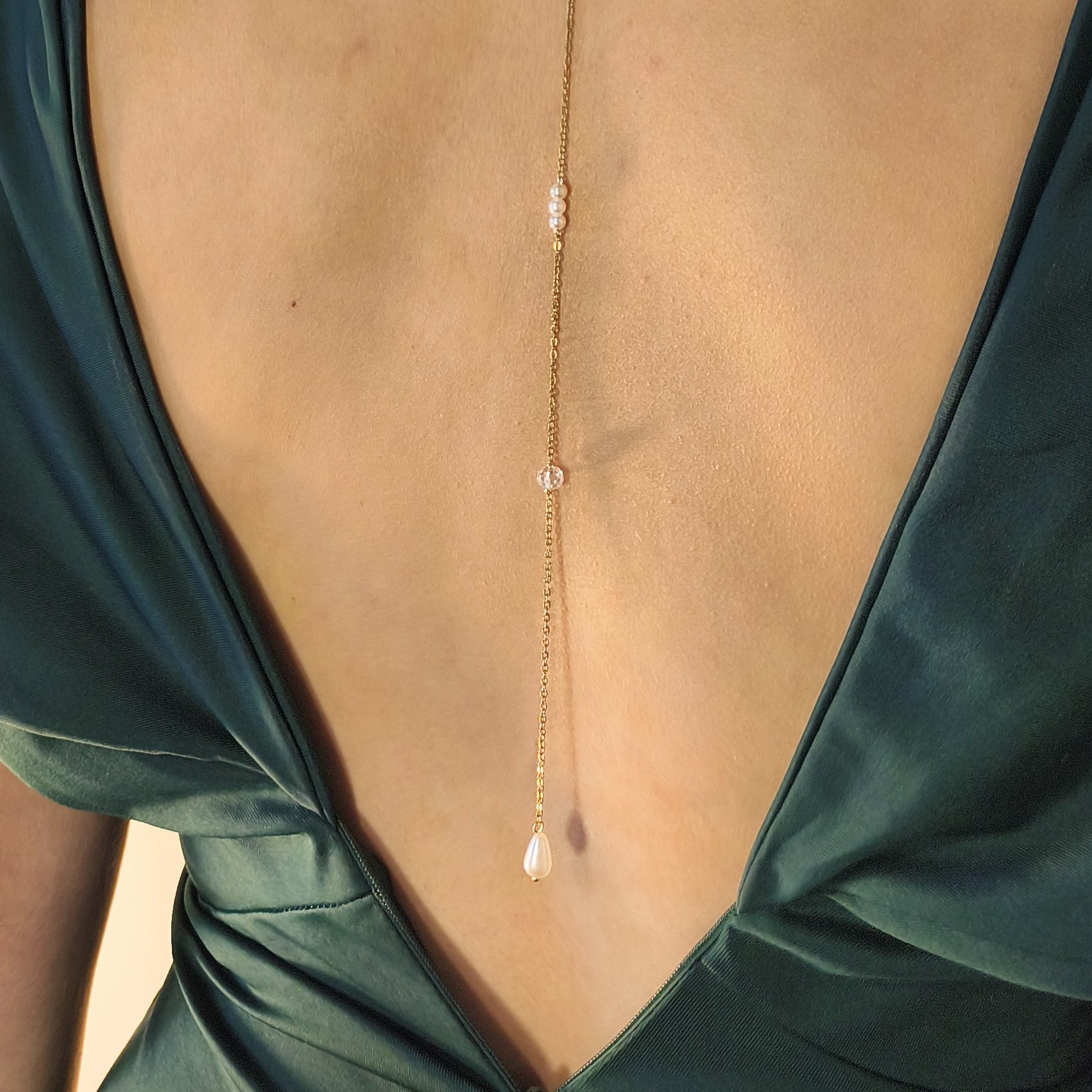 Le collier de dos Éclat Nymphe se pose comme une caresse lumineuse sur la peau.