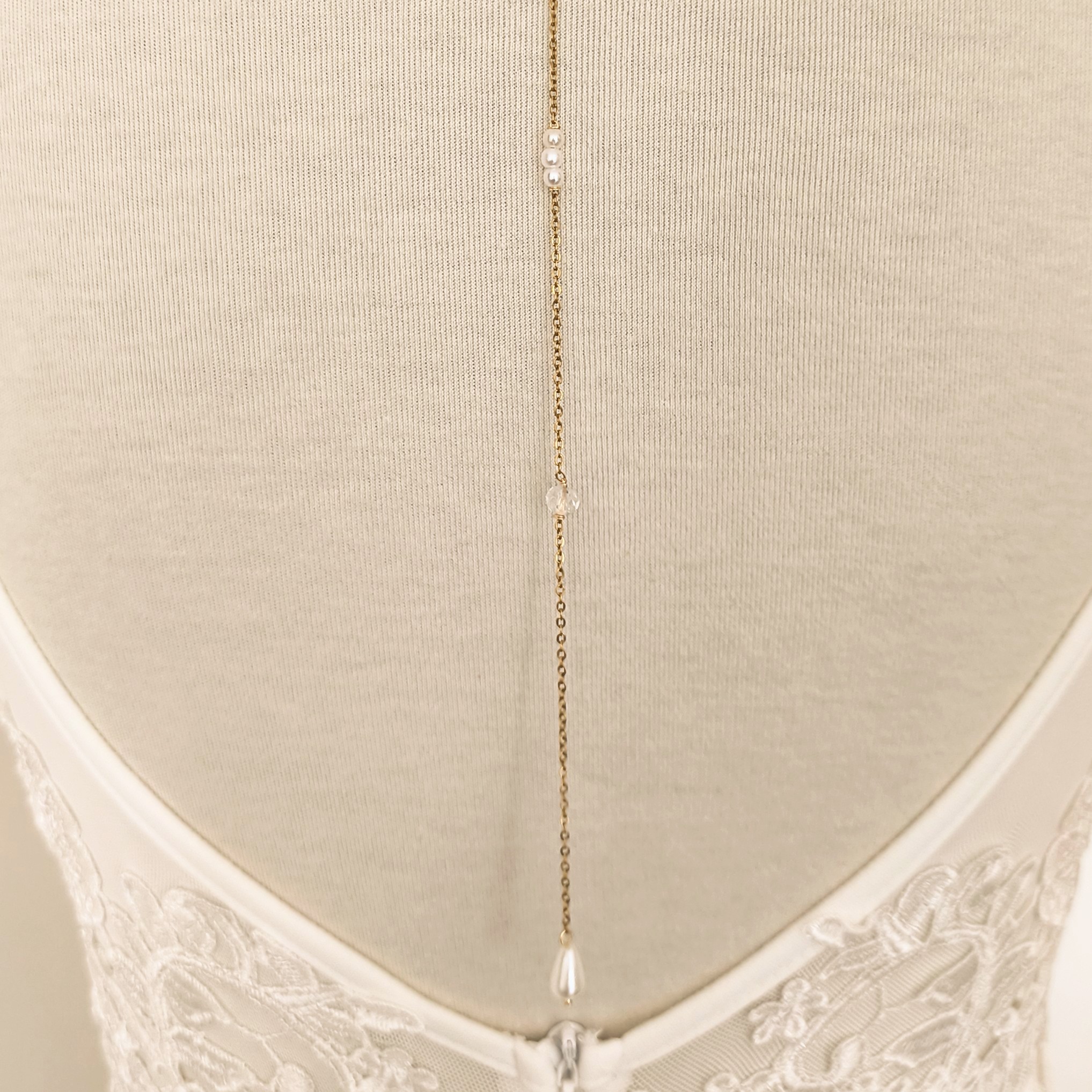 Un souffle de lumière glisse le long du dos, porté par des perles nacrées et des perles de verre.