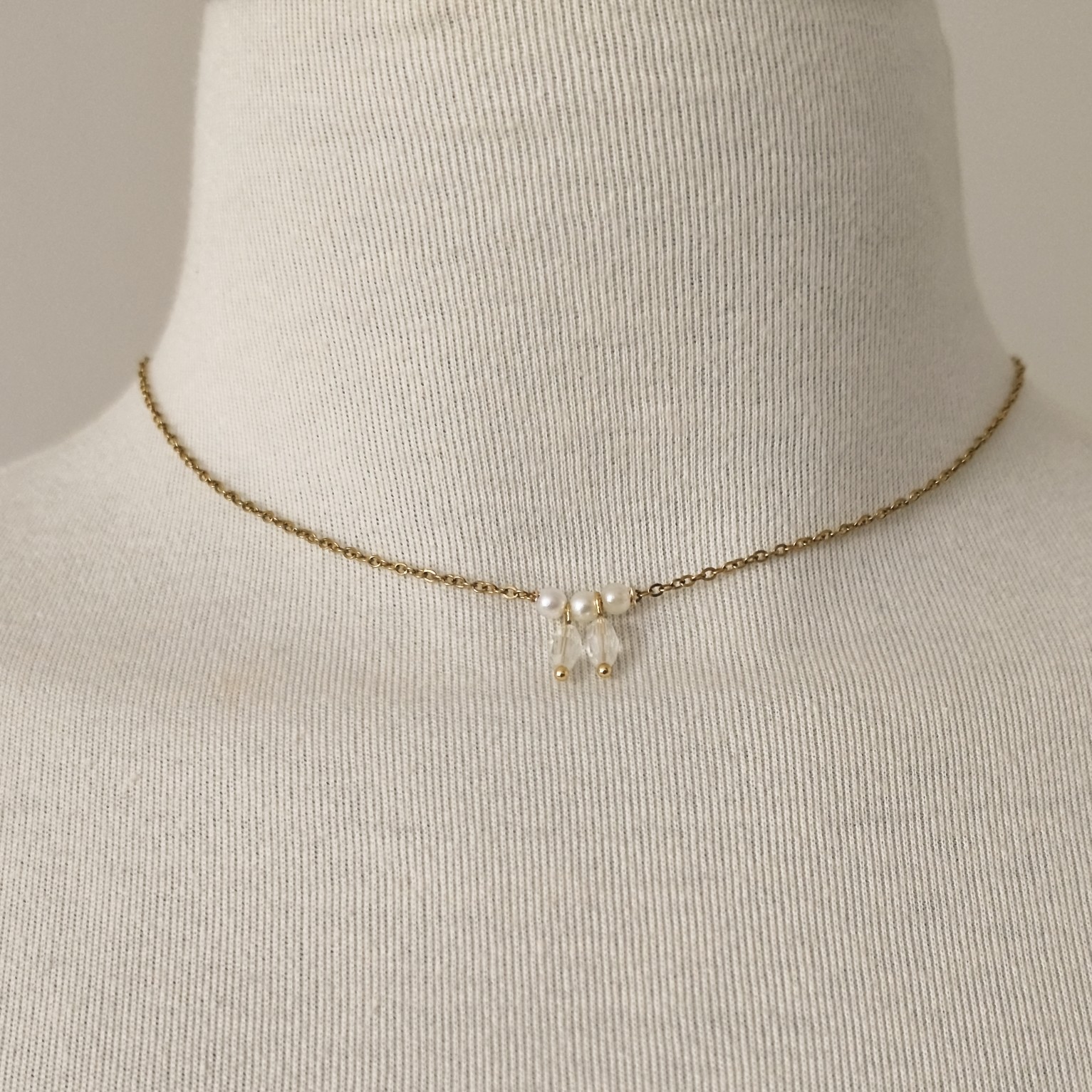 Sa chaîne fine descend délicatement le long du dos, rythmée par des perles nacrées et des perles de verre qui captent la lumière avec douceur.