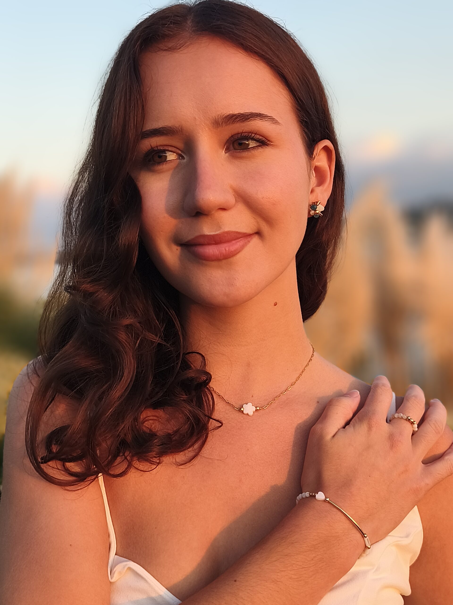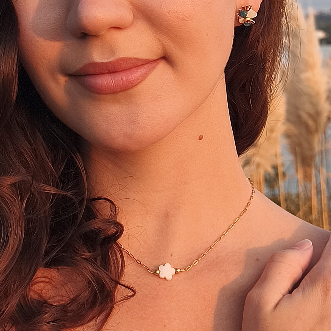 Créé avec passion et minutie, le collier Lueur Bohème reflète tout l’esprit de la collection : un équilibre entre simplicité, élégance et charme naturel. Sa fleur centrale, façonnée à la main, capte la lumière et révèle une brillance douce et apaisante.