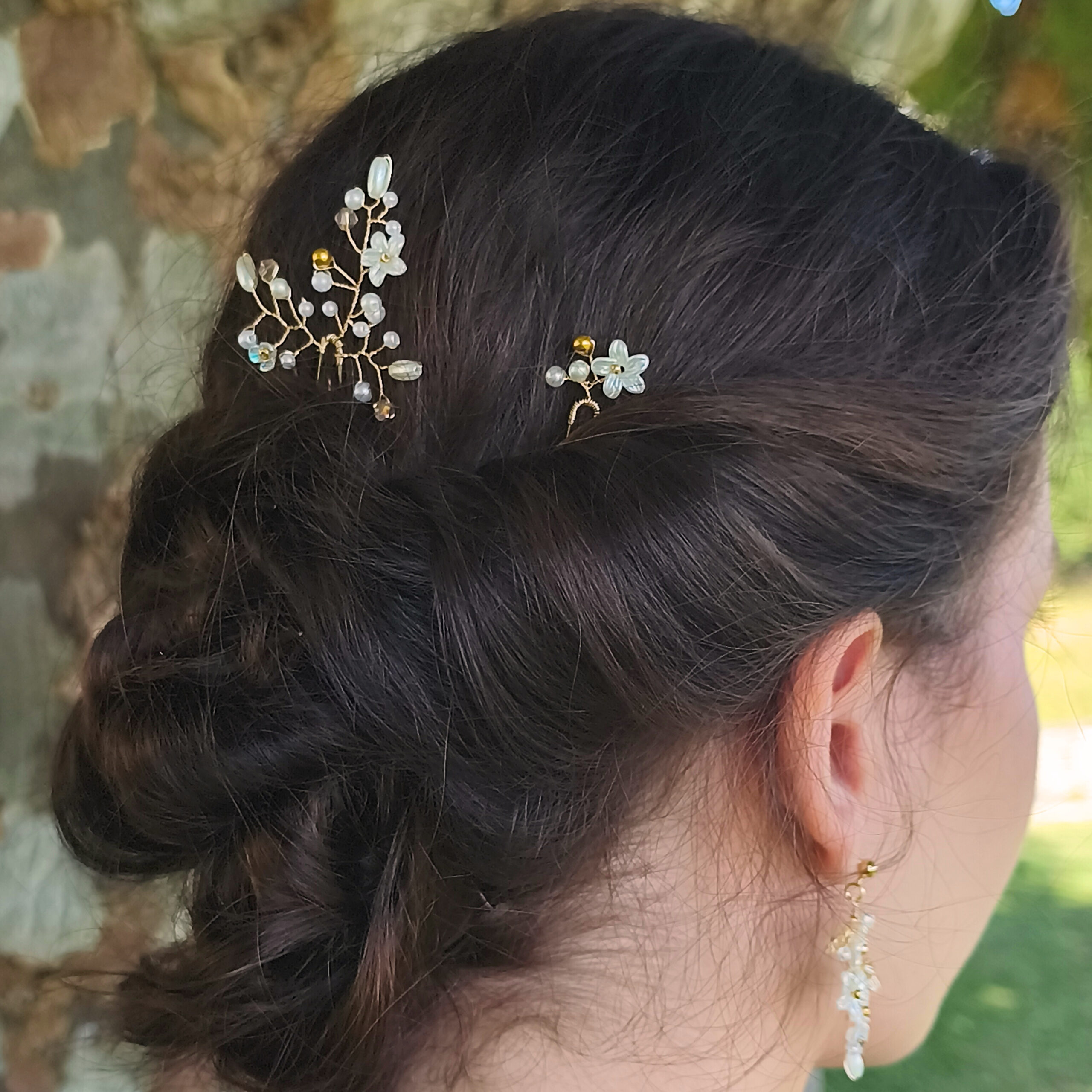 Sublimez votre coiffure d’un éclat floral doré : des pics à cheveux délicats qui captent la lumière et révèlent votre élégance naturelle.